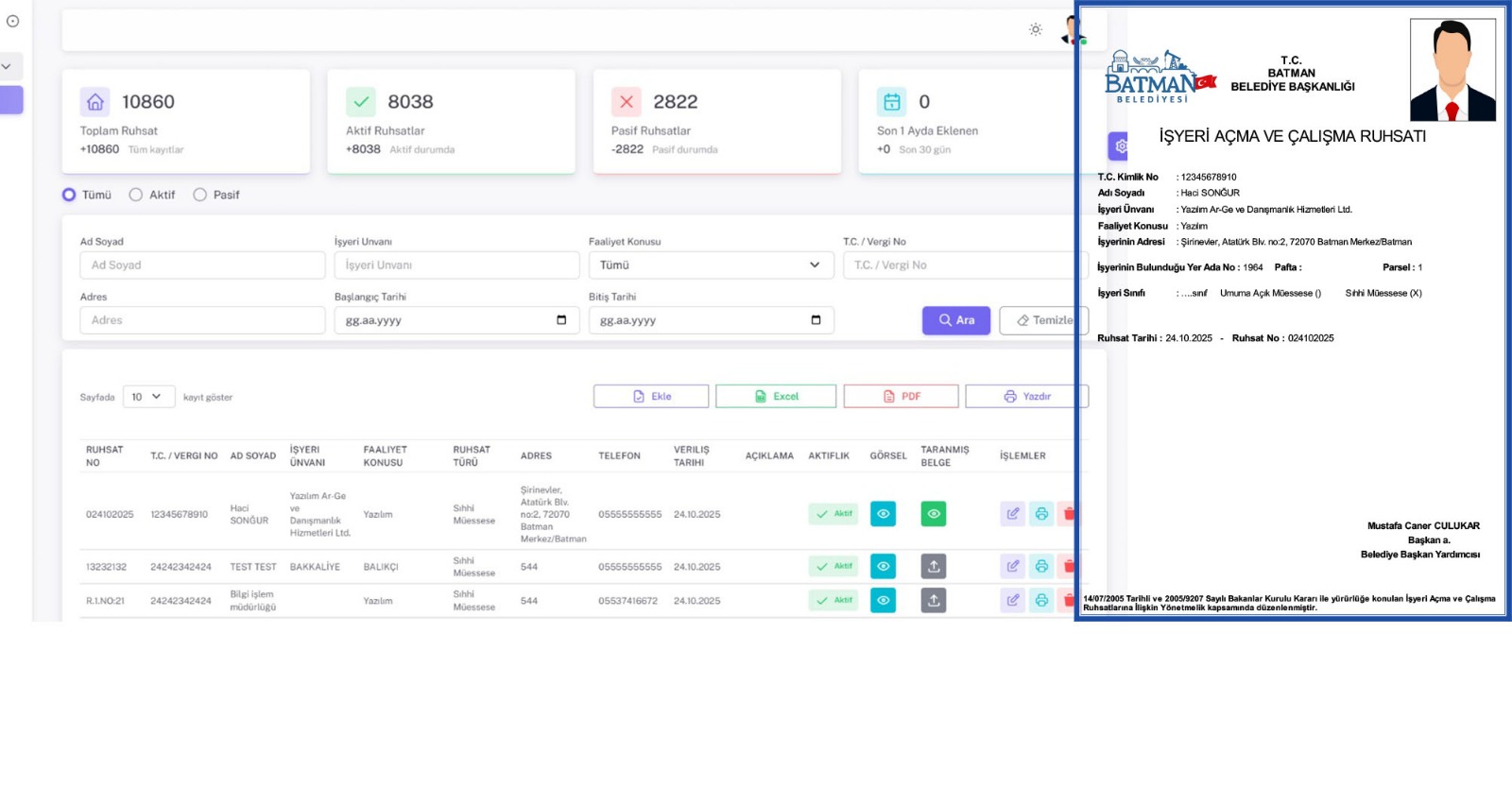 Batman genelinde yürütülen dijital dönüşüm sayesinde, kaç işyerinin ruhsatının bulunduğu ve hangi faaliyetlerde bulunduğu da artık net ve izlenebilir hale geldi.
